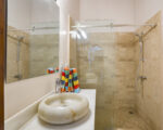 Welcome to our 2-bedroom tropical getaway! The main bedroom features a queen bed, private bathroom, A/C, and a balcony. The second bedroom has a queen bunk bed and its own bathroom. There are 2 full bathrooms and a half bath. Common areas include a living room and TV area, dining room, and a fully equipped kitchen with granite countertops. We also have a private pool and a balcony for outdoor enjoyment.